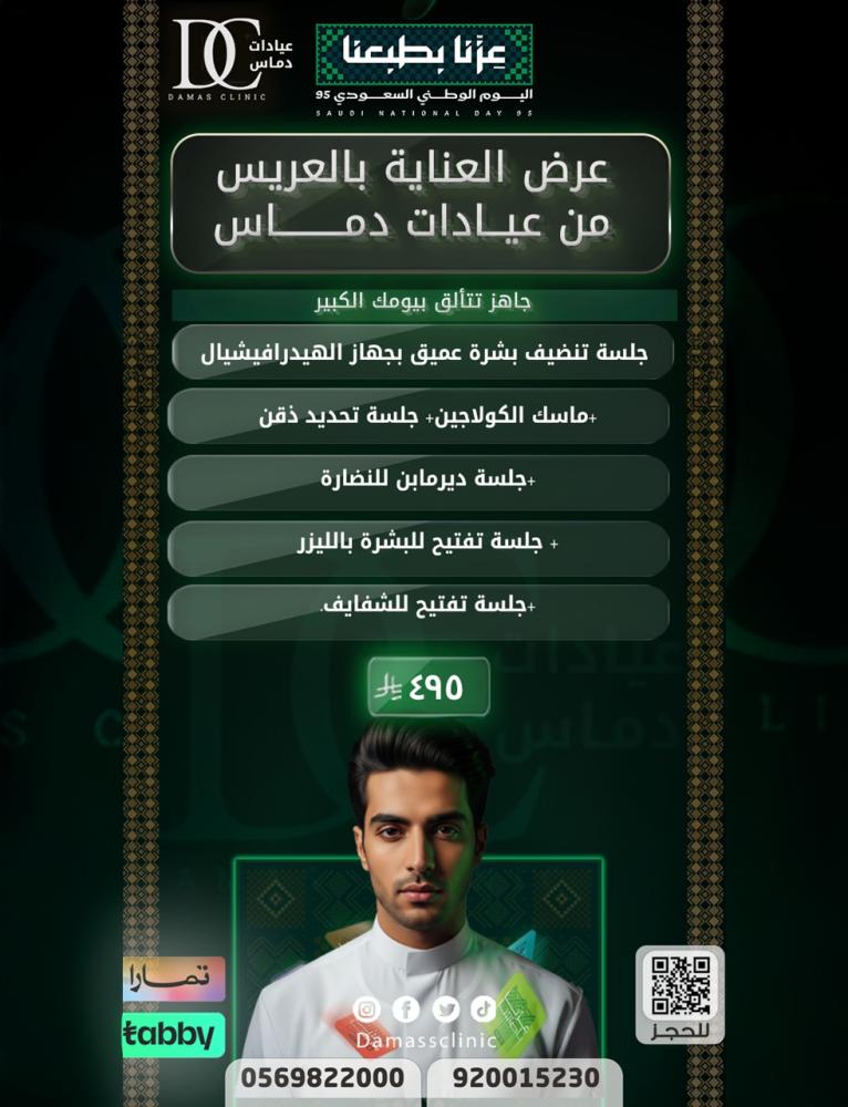 عروض اليوم الوطني _ عروض العنايه بالعريس ( جلسة تنظيف بشره عميق بجهاز الهيدرافيشيل + ماسك كولاجين + جلسة تحديد ذقن + جلسة ديرمابن نضاره + جلسة تفتيح البشره بالليزر + جلسة تفتيح الشفايف بالليزر )